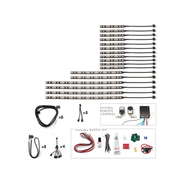 Also Includes: (1) 16 Function Wireless MultiColor Remote Control Module w/ (2) Key FOBs, In-Line Fuse, Zip Ties, Alcohol Pads, and 3M Adhesion Promoter.